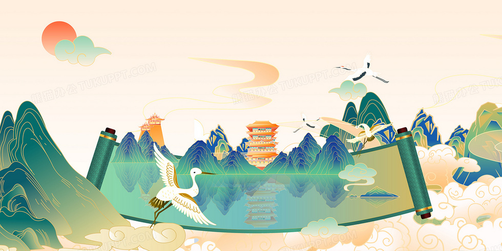 本作品内容为简约国潮山水画卷背景图, 格式为 psd, 大小22 MB, 图片尺寸为4724 x 2362, 作品中背景图片无需修改, 源文件无水印,可以直接使用, 欢迎使用熊猫办公。 如认为平台内容涉嫌侵权,可通过邮件:tousu@tukuppt.com提出书面通知,我们将及时处理。