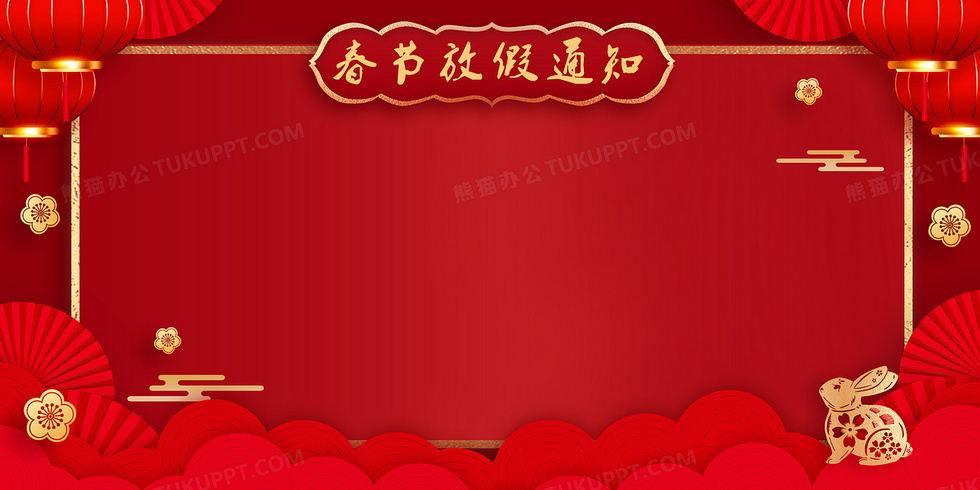 本作品内容为春节放假通知红金2023兔年喜庆背景, 格式为 psd, 大小31 MB, 图片尺寸为4724 x 2362, 作品中背景图片无需修改, 源文件无水印,可以直接使用, 欢迎使用熊猫办公。 如认为平台内容涉嫌侵权,可通过邮件:tousu@tukuppt.com提出书面通知,我们将及时处理。