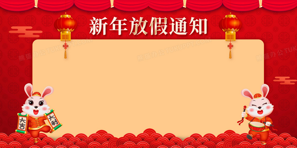 本作品内容为中国风红色喜庆兔年放假通知背景, 格式为 psd, 大小11 MB, 图片尺寸为4724 x 2362, 作品中背景图片无需修改, 源文件无水印,可以直接使用, 欢迎使用熊猫办公。 如认为平台内容涉嫌侵权,可通过邮件:tousu@tukuppt.com提出书面通知,我们将及时处理。