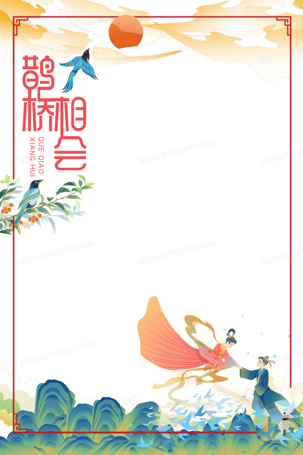 本作品内容为七夕喜鹊花卉清新大气背景, 格式为 psd, 大小33 MB, 图片尺寸为3543 x 5315, 作品中背景图片无需修改, 源文件无水印,可以直接使用, 欢迎使用熊猫办公。 如认为平台内容涉嫌侵权,可通过邮件:tousu@tukuppt.com提出书面通知,我们将及时处理。