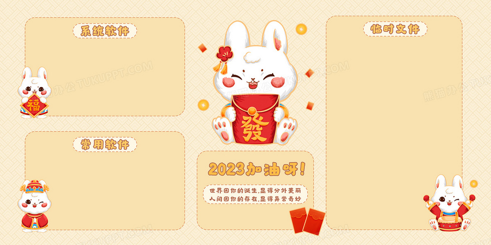 本作品内容为兔年新年分区电脑壁纸, 格式为 psd, 大小20 MB, 图片尺寸为4722 x 2361, 作品中背景图片无需修改, 源文件无水印,可以直接使用, 欢迎使用熊猫办公。 如认为平台内容涉嫌侵权,可通过邮件:tousu@tukuppt.com提出书面通知,我们将及时处理。