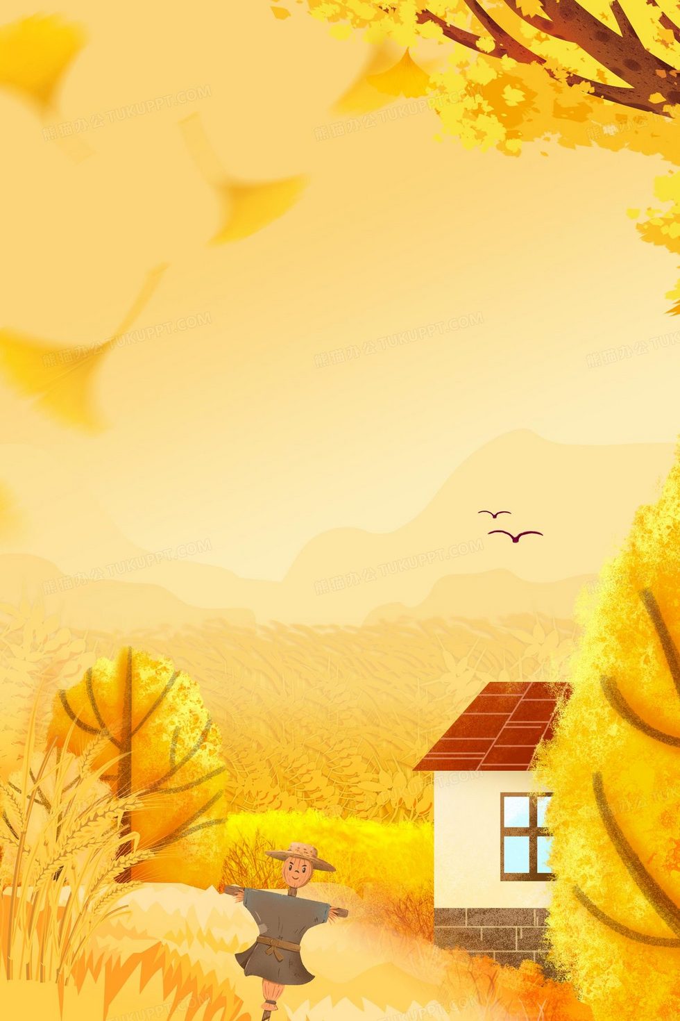 本作品内容为秋日麦田橙色插画节气背景, 格式为 psd, 大小39 MB, 图片尺寸为2362 x 3543, 作品中背景图片无需修改, 源文件无水印,可以直接使用, 欢迎使用熊猫办公。 如认为平台内容涉嫌侵权,可通过邮件:tousu@tukuppt.com提出书面通知,我们将及时处理。