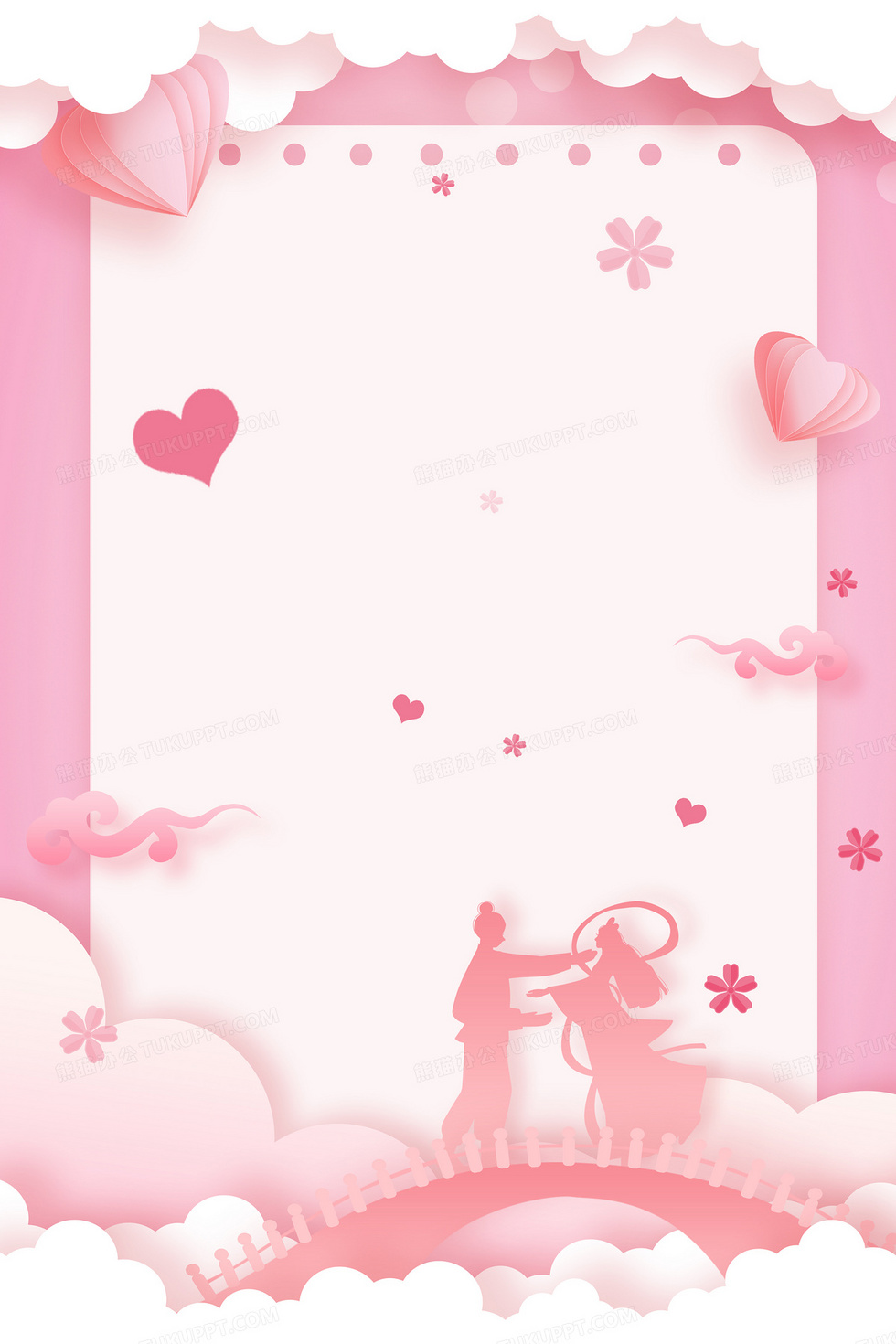 本作品内容为粉色小清新剪纸风七夕情人节牛郎织女鹊桥剪影背景, 格式为 psd, 大小23 MB, 图片尺寸为3543 x 5315, 作品中背景图片无需修改, 源文件无水印,可以直接使用, 欢迎使用熊猫办公。 如认为平台内容涉嫌侵权,可通过邮件:tousu@tukuppt.com提出书面通知,我们将及时处理。