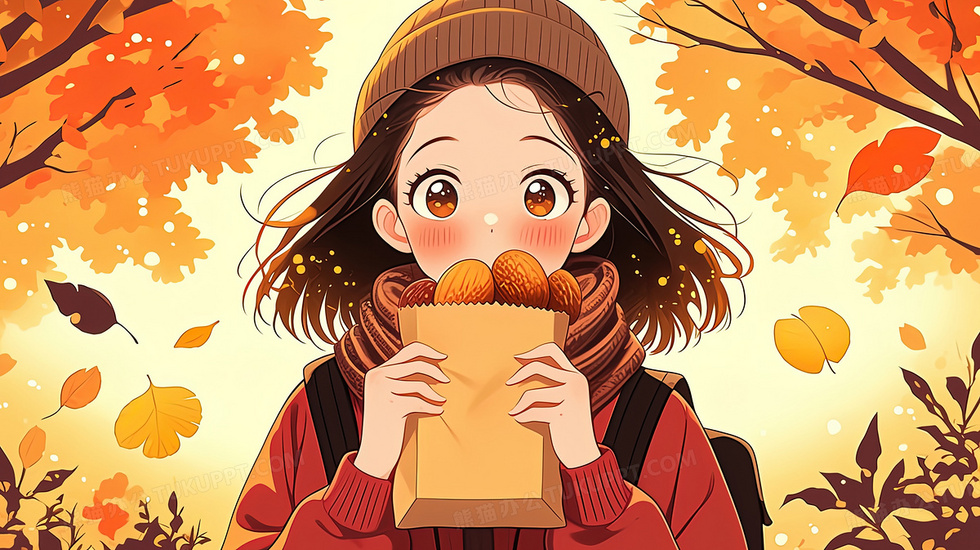首页 > 插画 > 科技艺术 > 卡通漫画 > 秋日树叶拿着糖炒栗子的文艺少女插画