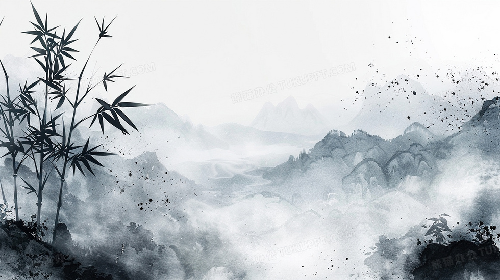 本作品内容为黑白山水中国风水墨背景, 格式为 jpg, 大小3 MB, 图片尺寸为2912 x 1632, 作品中背景图片无需修改, 源文件无水印,可以直接使用, 欢迎使用熊猫办公。 如认为平台内容涉嫌侵权,可通过邮件:tousu@tukuppt.com提出书面通知,我们将及时处理。