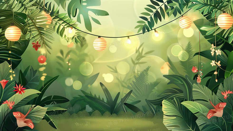 本作品内容为挂着彩灯的植物树叶插画, 格式为 jpg, 大小4 MB, 图片尺寸为2912 x 1632, 源文件无水印, 欢迎使用熊猫办公。 如认为平台内容涉嫌侵权,可通过邮件:tousu@tukuppt.com提出书面通知,我们将及时处理。
