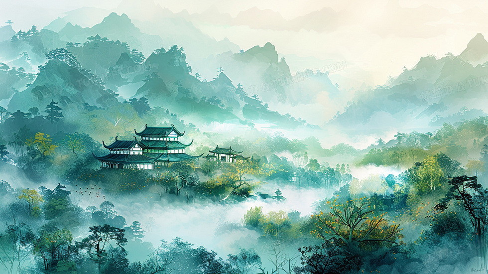 首页 > 插画 > 科技艺术 > 中国风 > 天空山水建筑风景插画