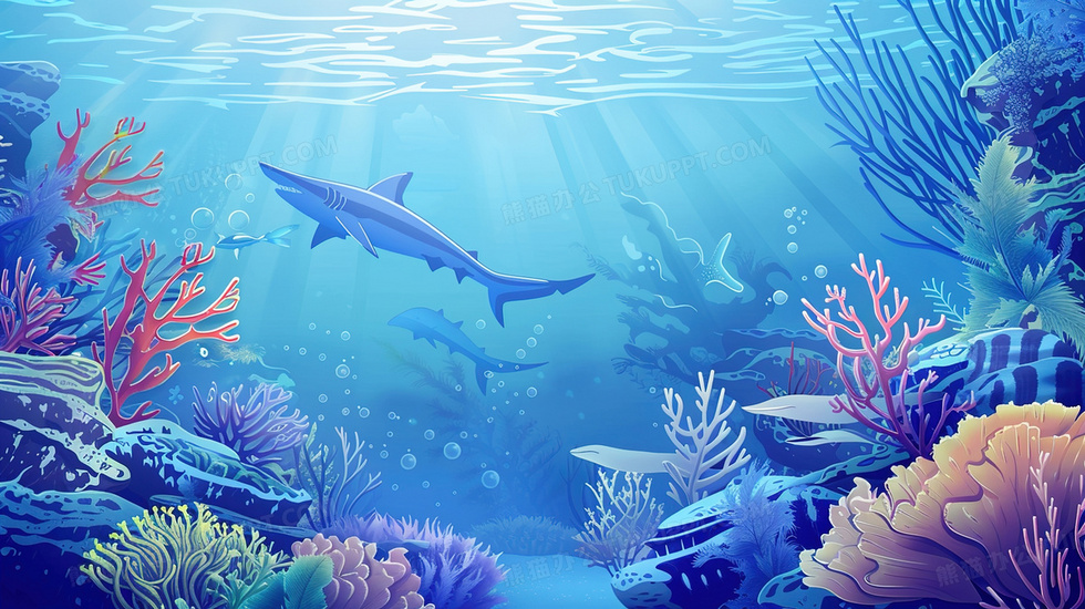 本作品内容为蓝色海底世界鲨鱼海藻插画, 格式为 jpg, 大小3 MB, 图片尺寸为2912 x 1632, 源文件无水印, 欢迎使用熊猫办公。 如认为平台内容涉嫌侵权,可通过邮件:tousu@tukuppt.com提出书面通知,我们将及时处理。