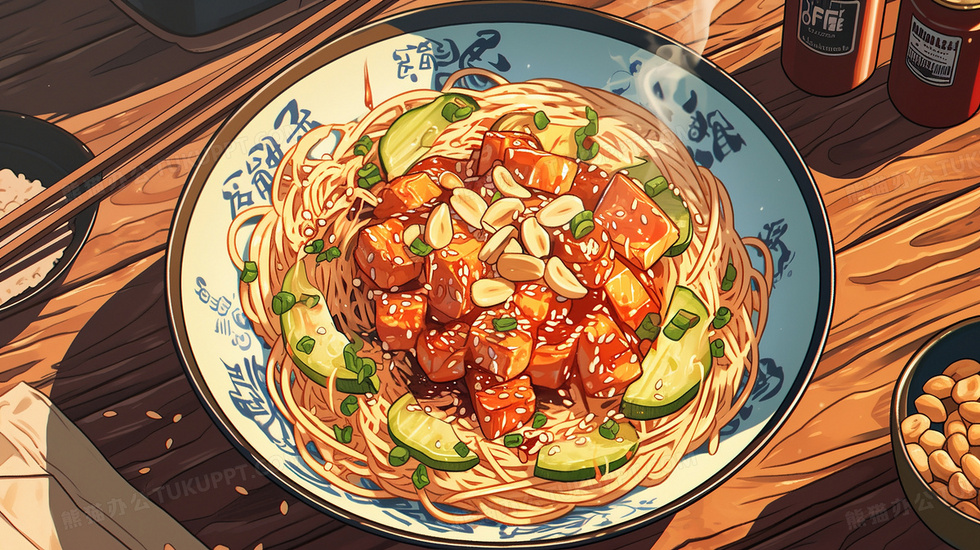 本作品内容为手绘风格鸡丁盖浇凉面的插画, 格式为 jpg, 大小4 MB, 图片尺寸为2912 x 1632, 源文件无水印, 欢迎使用熊猫办公。 如认为平台内容涉嫌侵权,可通过邮件:tousu@tukuppt.com提出书面通知,我们将及时处理。