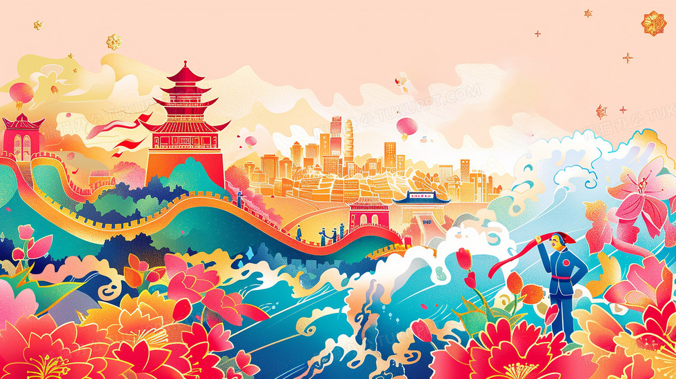 本作品内容为国庆节彩色长城牡丹人民创意插画, 格式为 jpg, 大小4 MB, 图片尺寸为2912 x 1632, 源文件无水印, 欢迎使用熊猫办公。 如认为平台内容涉嫌侵权,可通过邮件:tousu@tukuppt.com提出书面通知,我们将及时处理。