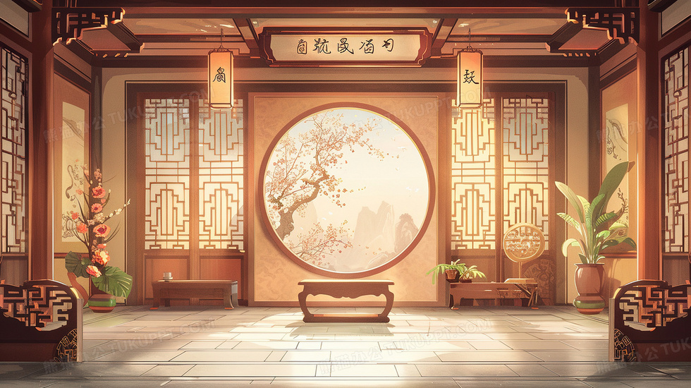 本作品内容为中国古建筑堂屋大厅插画, 格式为 jpg, 大小4 MB, 图片尺寸为2912 x 1632, 源文件无水印, 欢迎使用熊猫办公。 如认为平台内容涉嫌侵权,可通过邮件:tousu@tukuppt.com提出书面通知,我们将及时处理。