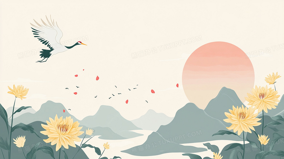 本作品内容为卡通菊花重阳节传统节日简约背景, 格式为 jpg, 大小2 MB, 图片尺寸为2912 x 1632, 作品中背景图片无需修改, 源文件无水印,可以直接使用, 欢迎使用熊猫办公。 如认为平台内容涉嫌侵权,可通过邮件:tousu@tukuppt.com提出书面通知,我们将及时处理。
