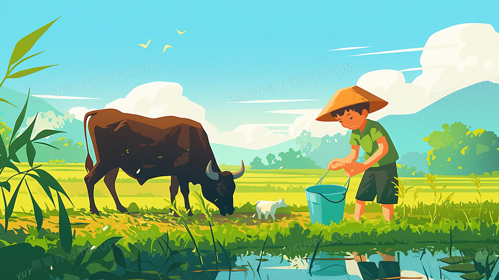 本作品内容为农村农田里农民与耕地的水牛插画, 格式为 jpg, 大小3 MB, 图片尺寸为2912 x 1632, 源文件无水印, 欢迎使用熊猫办公。 如认为平台内容涉嫌侵权,可通过邮件:tousu@tukuppt.com提出书面通知,我们将及时处理。