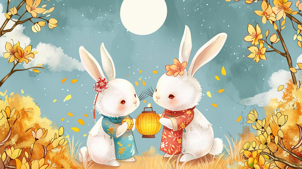 本作品内容为卡通中秋节提着灯笼的两只小兔子插画, 格式为 jpg, 大小3 MB, 图片尺寸为2912 x 1632, 源文件无水印, 欢迎使用熊猫办公。 如认为平台内容涉嫌侵权,可通过邮件:tousu@tukuppt.com提出书面通知,我们将及时处理。
