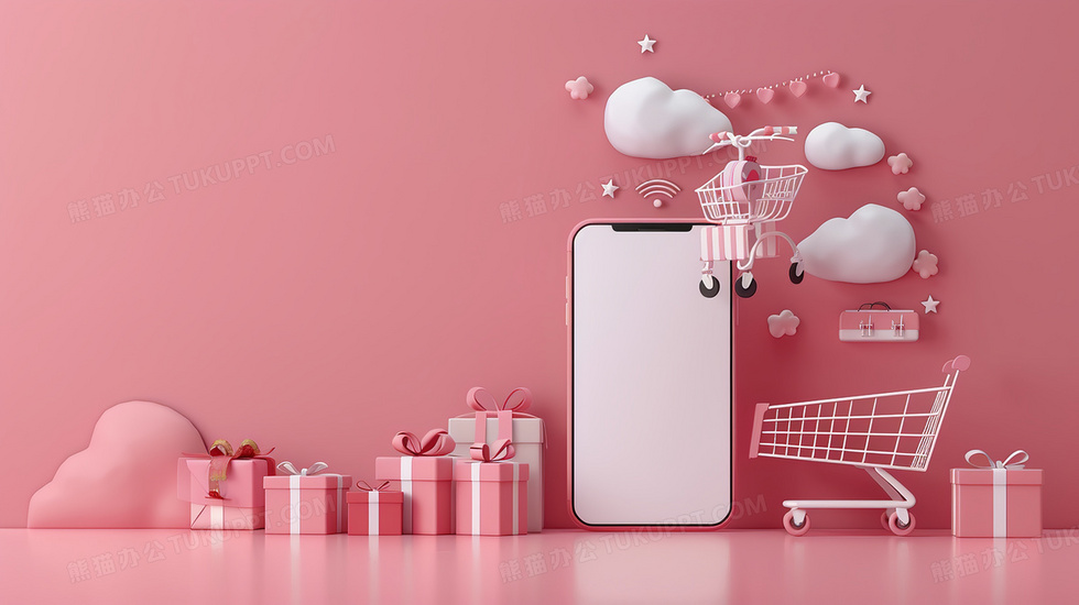 本作品内容为3D风格网上购物粉色背景, 格式为 jpg, 大小4 MB, 图片尺寸为2912 x 1632, 作品中背景图片无需修改, 源文件无水印,可以直接使用, 欢迎使用熊猫办公。 如认为平台内容涉嫌侵权,可通过邮件:tousu@tukuppt.com提出书面通知,我们将及时处理。