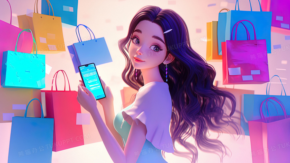本作品内容为3D手机线上网购的女孩插画, 格式为 jpg, 大小3 MB, 图片尺寸为2912 x 1632, 源文件无水印, 欢迎使用熊猫办公。 如认为平台内容涉嫌侵权,可通过邮件:tousu@tukuppt.com提出书面通知,我们将及时处理。