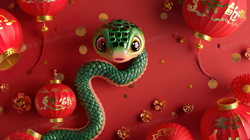 本作品内容为红色立体的卡通青蛇与灯笼插画, 格式为 jpg, 大小3 MB, 图片尺寸为2912 x 1632, 源文件无水印, 欢迎使用熊猫办公。 如认为平台内容涉嫌侵权,可通过邮件:tousu@tukuppt.com提出书面通知,我们将及时处理。