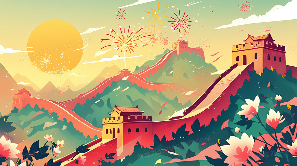 本作品内容为万里长城放烟花庆祝国庆插画, 格式为 jpg, 大小3 MB, 图片尺寸为2912 x 1632, 源文件无水印, 欢迎使用熊猫办公。 如认为平台内容涉嫌侵权,可通过邮件:tousu@tukuppt.com提出书面通知,我们将及时处理。