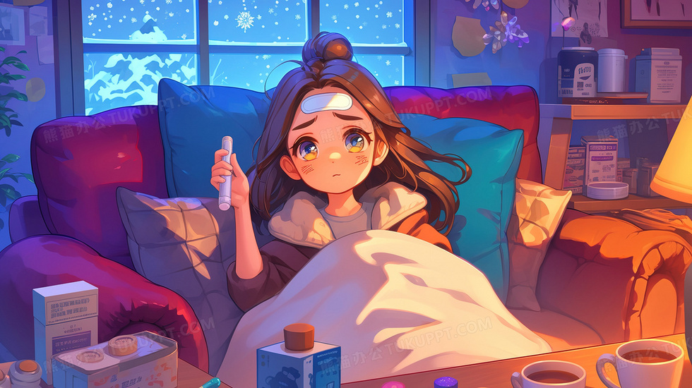 本作品内容为生病发烧难受躺沙发上休息的女孩插画, 格式为 jpg, 大小3 MB, 图片尺寸为2912 x 1632, 源文件无水印, 欢迎使用熊猫办公。 如认为平台内容涉嫌侵权,可通过邮件:tousu@tukuppt.com提出书面通知,我们将及时处理。