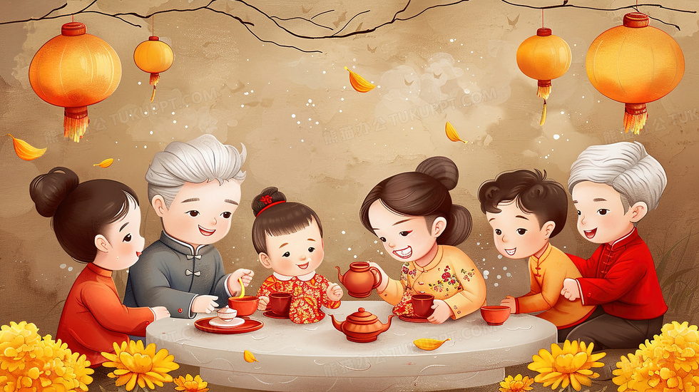 本作品内容为一家人在一起吃饭喝茶温馨插画, 格式为 jpg, 大小4 MB, 图片尺寸为2912 x 1632, 源文件无水印, 欢迎使用熊猫办公。 如认为平台内容涉嫌侵权,可通过邮件:tousu@tukuppt.com提出书面通知,我们将及时处理。
