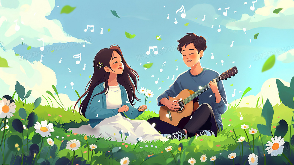 本作品内容为卡通情侣在草坪弹吉他表演插画, 格式为 jpg, 大小3 MB, 图片尺寸为2912 x 1632, 源文件无水印, 欢迎使用熊猫办公。 如认为平台内容涉嫌侵权,可通过邮件:tousu@tukuppt.com提出书面通知,我们将及时处理。