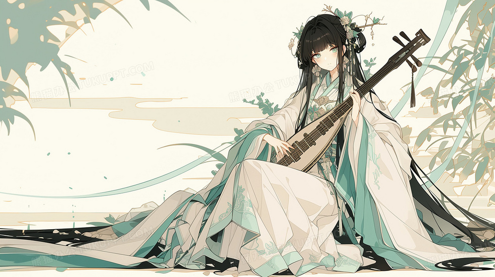 本作品内容为绿色中国风卡通女孩弹琵琶插画, 格式为 jpg, 大小3 MB, 图片尺寸为2912 x 1632, 源文件无水印, 欢迎使用熊猫办公。 如认为平台内容涉嫌侵权,可通过邮件:tousu@tukuppt.com提出书面通知,我们将及时处理。