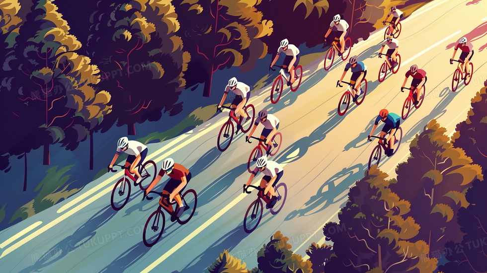 本作品内容为自行车队骑行比赛俯视图插画, 格式为 jpg, 大小3 MB, 图片尺寸为2912 x 1632, 源文件无水印, 欢迎使用熊猫办公。 如认为平台内容涉嫌侵权,可通过邮件:tousu@tukuppt.com提出书面通知,我们将及时处理。