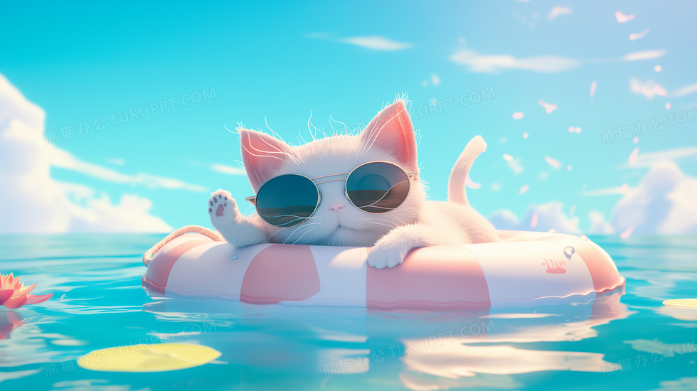 本作品内容为一只戴墨镜的猫咪在游泳圈上享受日光浴插画, 格式为 jpg, 大小6 MB, 图片尺寸为2912 x 1632, 源文件无水印, 欢迎使用熊猫办公。 如认为平台内容涉嫌侵权,可通过邮件:tousu@tukuppt.com提出书面通知,我们将及时处理。
