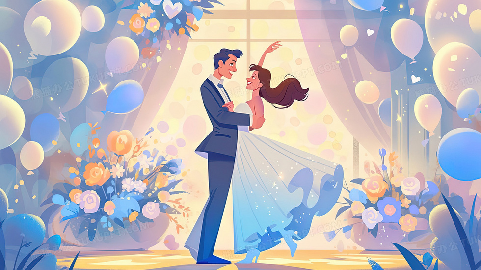 本作品内容为浪漫婚礼气球跳舞的新婚夫妻插画, 格式为 jpg, 大小3 MB, 图片尺寸为2912 x 1632, 源文件无水印, 欢迎使用熊猫办公。 如认为平台内容涉嫌侵权,可通过邮件:tousu@tukuppt.com提出书面通知,我们将及时处理。