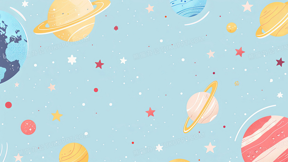 本作品内容为卡通简约星球背景, 格式为 jpg, 大小3 MB, 图片尺寸为2912 x 1632, 作品中背景图片无需修改, 源文件无水印,可以直接使用, 欢迎使用熊猫办公。 如认为平台内容涉嫌侵权,可通过邮件:tousu@tukuppt.com提出书面通知,我们将及时处理。