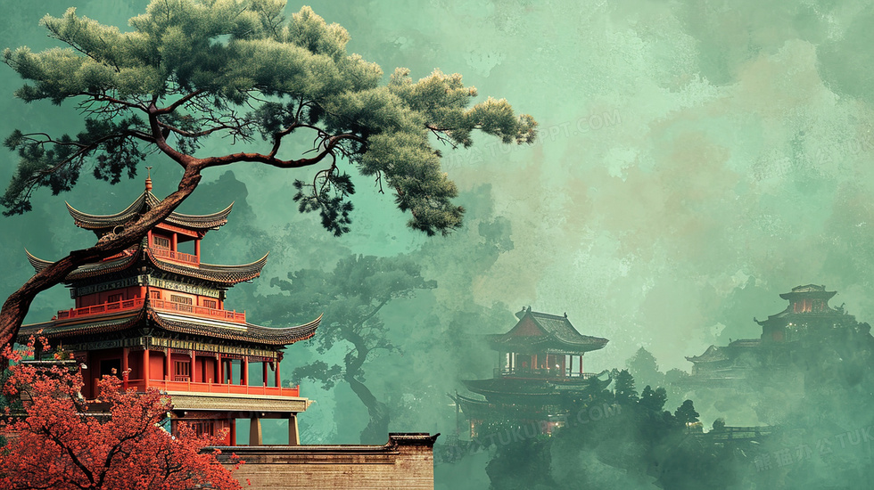 本作品内容为中式古建筑旁的松树插画, 格式为 jpg, 大小4 MB, 图片尺寸为2912 x 1632, 源文件无水印, 欢迎使用熊猫办公。 如认为平台内容涉嫌侵权,可通过邮件:tousu@tukuppt.com提出书面通知,我们将及时处理。