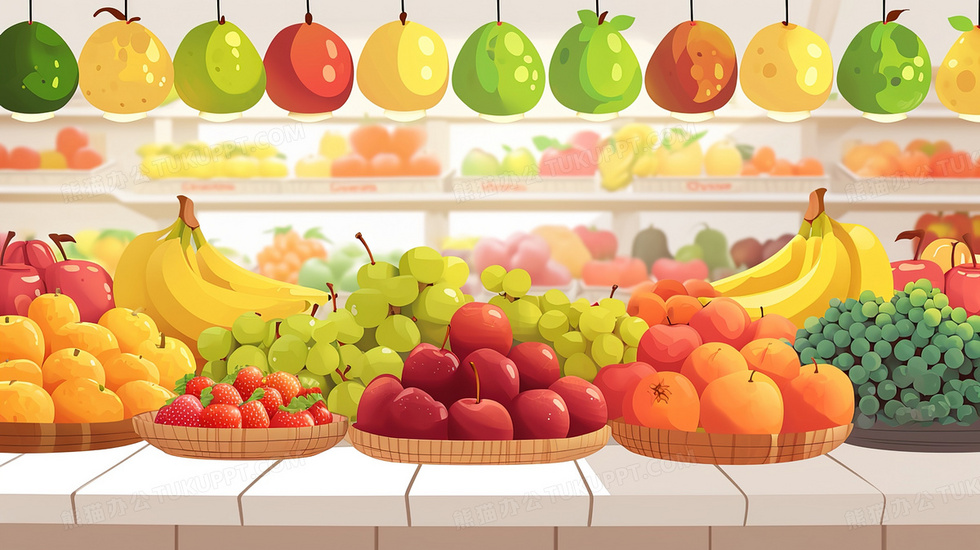 本作品内容为水果店里的琳琅满目的水果插画, 格式为 jpg, 大小2 MB, 图片尺寸为2912 x 1632, 源文件无水印, 欢迎使用熊猫办公。 如认为平台内容涉嫌侵权,可通过邮件:tousu@tukuppt.com提出书面通知,我们将及时处理。