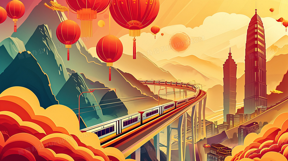 本作品内容为国潮春运铁路交通运输风景创意插画, 格式为 jpg, 大小4 MB, 图片尺寸为2912 x 1632, 源文件无水印, 欢迎使用熊猫办公。 如认为平台内容涉嫌侵权,可通过邮件:tousu@tukuppt.com提出书面通知,我们将及时处理。