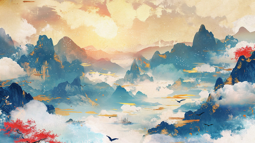 本作品内容为彩色唯美国潮鎏金山水画插画, 格式为 jpg, 大小4 MB, 图片尺寸为2912 x 1632, 源文件无水印, 欢迎使用熊猫办公。 如认为平台内容涉嫌侵权,可通过邮件:tousu@tukuppt.com提出书面通知,我们将及时处理。