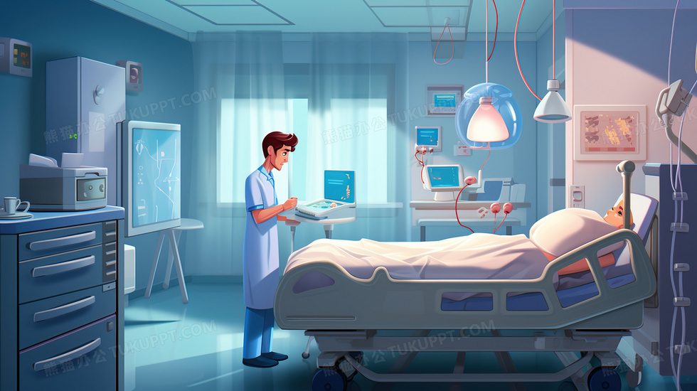 本作品内容为医院私家病房里的场景插画, 格式为 jpg, 大小2 MB, 图片尺寸为2912 x 1632, 源文件无水印, 欢迎使用熊猫办公。 如认为平台内容涉嫌侵权,可通过邮件:tousu@tukuppt.com提出书面通知,我们将及时处理。