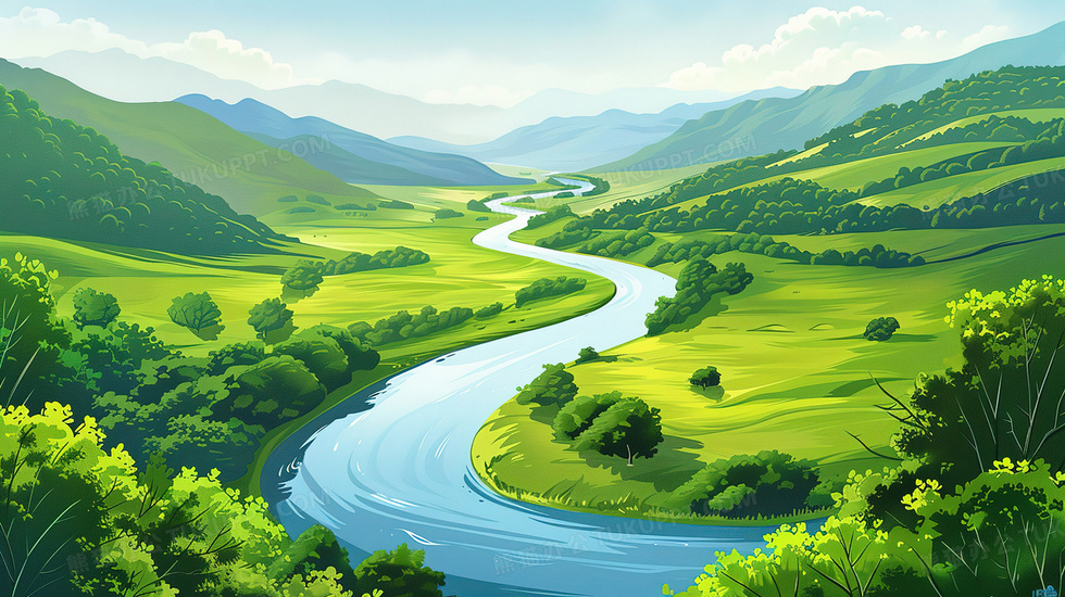 本作品内容为绿色生态河流风景插画, 格式为 jpg, 大小4 MB, 图片尺寸为2912 x 1632, 源文件无水印, 欢迎使用熊猫办公。 如认为平台内容涉嫌侵权,可通过邮件:tousu@tukuppt.com提出书面通知,我们将及时处理。