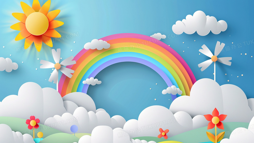 本作品内容为儿童节日蓝天白云彩虹装饰插画, 格式为 jpg, 大小2 MB, 图片尺寸为2912 x 1632, 源文件无水印, 欢迎使用熊猫办公。 如认为平台内容涉嫌侵权,可通过邮件:tousu@tukuppt.com提出书面通知,我们将及时处理。