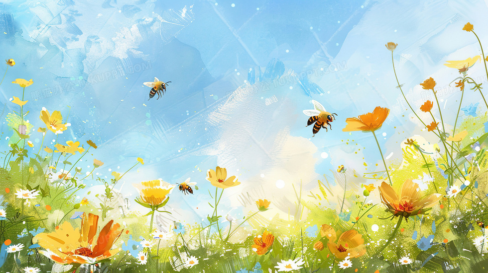 本作品内容为蓝天白云花丛蜜蜂插画, 格式为 jpg, 大小4 MB, 图片尺寸为2912 x 1632, 源文件无水印, 欢迎使用熊猫办公。 如认为平台内容涉嫌侵权,可通过邮件:tousu@tukuppt.com提出书面通知,我们将及时处理。