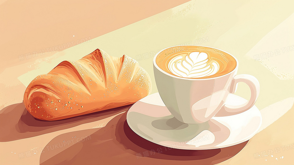 本作品内容为拉花咖啡和面包下午茶插画, 格式为 jpg, 大小2 MB, 图片尺寸为2912 x 1632, 源文件无水印, 欢迎使用熊猫办公。 如认为平台内容涉嫌侵权,可通过邮件:tousu@tukuppt.com提出书面通知,我们将及时处理。