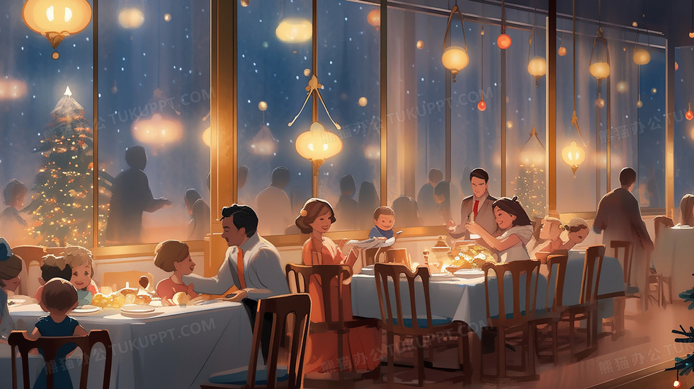 本作品内容为在餐厅里庆祝节日的家人们插画, 格式为 jpg, 大小3 MB, 图片尺寸为2912 x 1632, 源文件无水印, 欢迎使用熊猫办公。 如认为平台内容涉嫌侵权,可通过邮件:tousu@tukuppt.com提出书面通知,我们将及时处理。