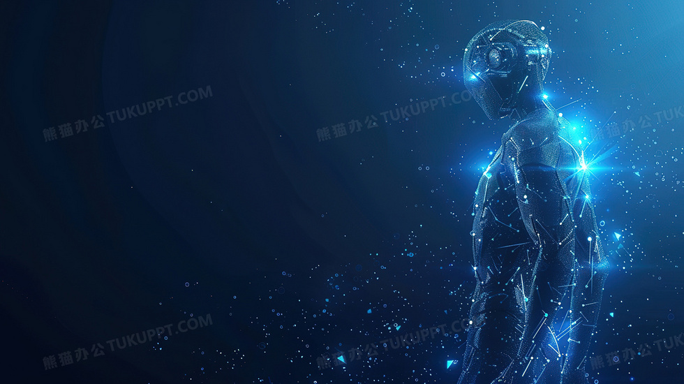 本作品内容为科技风蓝色粒子机器人背景, 格式为 jpg, 大小3 MB, 图片尺寸为2912 x 1632, 作品中背景图片无需修改, 源文件无水印,可以直接使用, 欢迎使用熊猫办公。 如认为平台内容涉嫌侵权,可通过邮件:tousu@tukuppt.com提出书面通知,我们将及时处理。