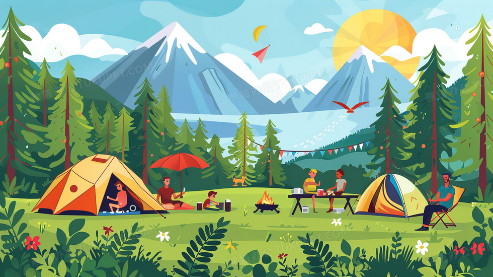 本作品内容为夏日野营度假插画, 格式为 jpg, 大小3 MB, 图片尺寸为2912 x 1632, 源文件无水印, 欢迎使用熊猫办公。 如认为平台内容涉嫌侵权,可通过邮件:tousu@tukuppt.com提出书面通知,我们将及时处理。