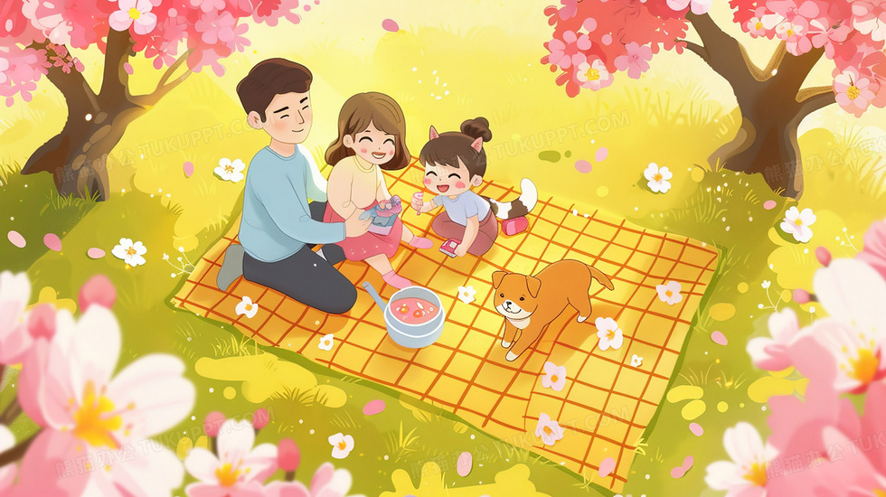 本作品内容为春天樱花树盛开的草地上野餐的一家人插画, 格式为 jpg, 大小3 MB, 图片尺寸为2912 x 1632, 源文件无水印, 欢迎使用熊猫办公。 如认为平台内容涉嫌侵权,可通过邮件:tousu@tukuppt.com提出书面通知,我们将及时处理。