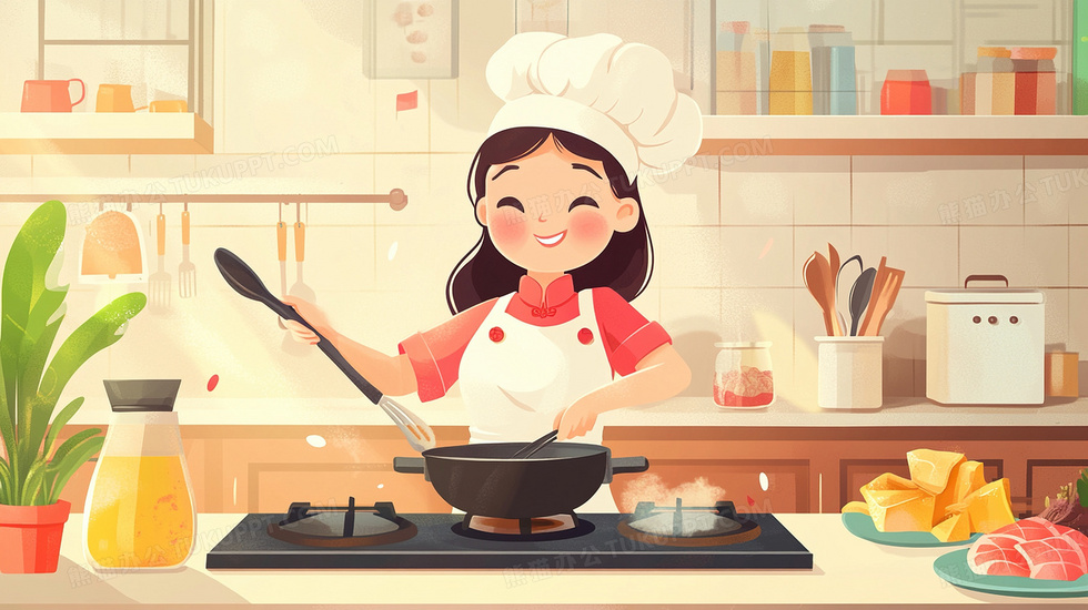 本作品内容为女厨师厨房做饭炒菜插画, 格式为 jpg, 大小3 MB, 图片尺寸为2912 x 1632, 源文件无水印, 欢迎使用熊猫办公。 如认为平台内容涉嫌侵权,可通过邮件:tousu@tukuppt.com提出书面通知,我们将及时处理。
