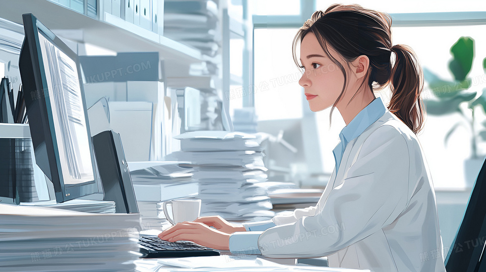 本作品内容为一个正在办公的女白领插画, 格式为 jpg, 大小1 MB, 图片尺寸为2912 x 1632, 源文件无水印, 欢迎使用熊猫办公。 如认为平台内容涉嫌侵权,可通过邮件:tousu@tukuppt.com提出书面通知,我们将及时处理。