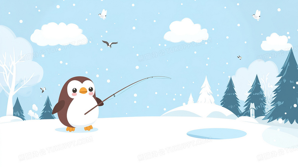 本作品内容为卡通企鹅钓鱼背景, 格式为 jpg, 大小1 MB, 图片尺寸为2912 x 1632, 作品中背景图片无需修改, 源文件无水印,可以直接使用, 欢迎使用熊猫办公。 如认为平台内容涉嫌侵权,可通过邮件:tousu@tukuppt.com提出书面通知,我们将及时处理。