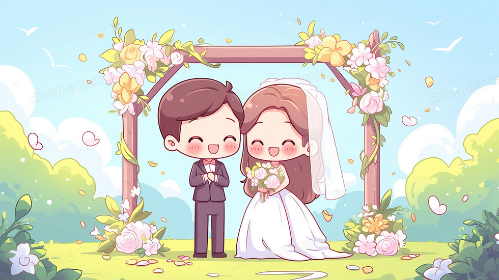 本作品内容为Q版卡通弧形花墙下的新婚夫妻插画, 格式为 jpg, 大小2 MB, 图片尺寸为2912 x 1632, 源文件无水印, 欢迎使用熊猫办公。 如认为平台内容涉嫌侵权,可通过邮件:tousu@tukuppt.com提出书面通知,我们将及时处理。