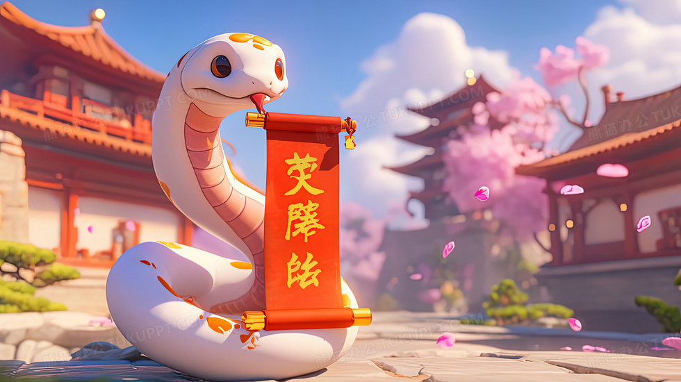 本作品内容为磅礴大气中式庭院建筑白蛇和春联插画, 格式为 jpg, 大小3 MB, 图片尺寸为2912 x 1632, 源文件无水印, 欢迎使用熊猫办公。 如认为平台内容涉嫌侵权,可通过邮件:tousu@tukuppt.com提出书面通知,我们将及时处理。