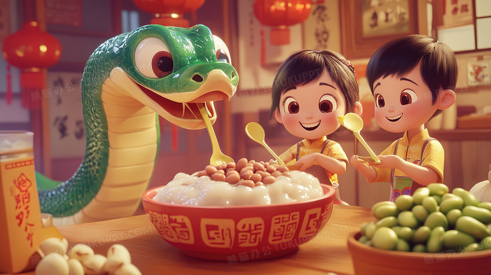 本作品内容为卡通蛇年儿童与青蛇吃腊八粥插画, 格式为 jpg, 大小3 MB, 图片尺寸为2912 x 1632, 源文件无水印, 欢迎使用熊猫办公。 如认为平台内容涉嫌侵权,可通过邮件:tousu@tukuppt.com提出书面通知,我们将及时处理。