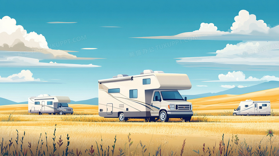 本作品内容为草原上的旅行房车插画, 格式为 jpg, 大小3 MB, 图片尺寸为2912 x 1632, 源文件无水印, 欢迎使用熊猫办公。 如认为平台内容涉嫌侵权,可通过邮件:tousu@tukuppt.com提出书面通知,我们将及时处理。